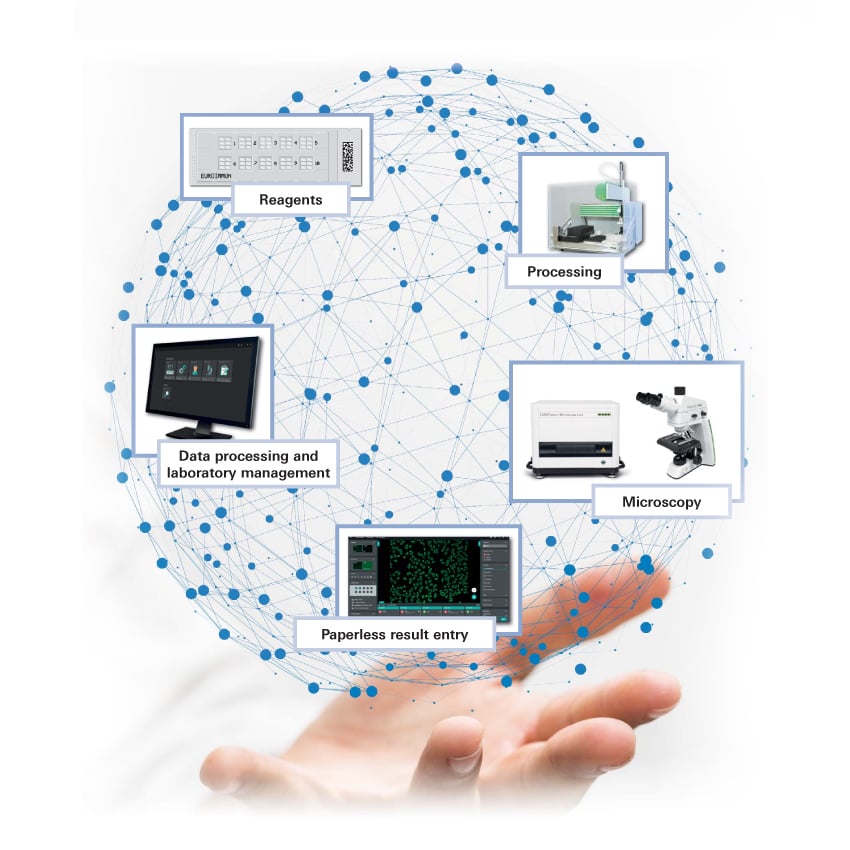 – Comprehensive product range for autoimmune and infection diagnostics based on BIOCHIPs with cultured cells, antigen dots (EUROPLUS), antigen-expressing cells and tissue sections